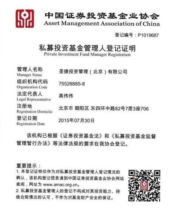拥有中国证券化投资基金业协会下发的私募基金管理资质。依托互联网,圣捷集团立足于为高净值客户提供持续发展稳健的财富增长咨询服务,通过深入了解客户需求,协助客户规划财富目标、制定财富策略。
